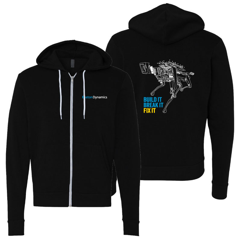 At Boston Dynamics, we’re always innovating and pushing the limits of robotics. This illustrated Spot full zip hoodie features the many parts and pieces it takes to build a successful robot, with the inspiring phrase “Build it, break it, fix it.” Printed full back with the Boston Dynamics wordmark on the left front chest, this Bella+Canvas hoodie is made with 8-ounce, 52/48 Airlume combed and ring spun cotton/poly fleece.