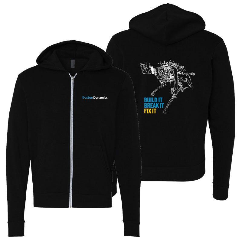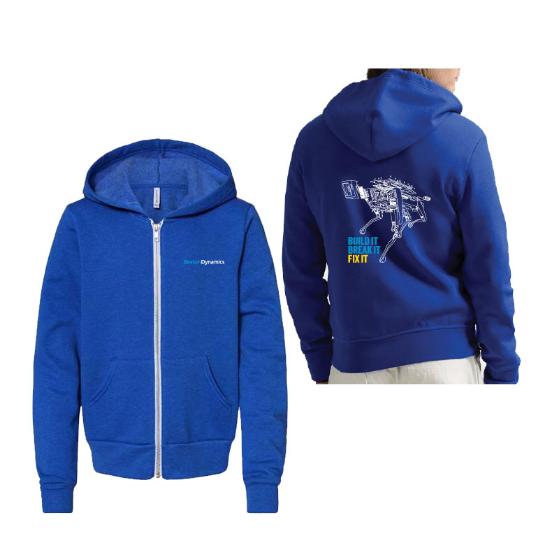 Because you demanded it, we've introduced a Youth version of our Spot Innovation Full Zip Hoodie! At Boston Dynamics, we’re always innovating and pushing the limits of robotics. This illustrated Spot full zip hoodie features the many parts and pieces it takes to build a successful robot, with the inspiring phrase “Build it, break it, fix it.” Printed full back with the Boston Dynamics wordmark on the left front chest, this Bella+Canvas hoodie is made with 8-ounce, 52/48 Airlume combed and ring spun cotton/poly fleece.